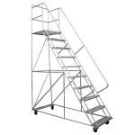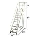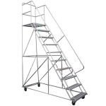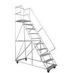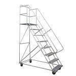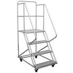contamos con escaleras móviles tipo avión en alturas: 1 – 1,5 – 2 – 2,5 – 3 – 3,5 – 4 mtrs. con plataforma de trabajo con distintas capacidades de carga, peldaños antideslizante, ruedas giratorias con frenos.
