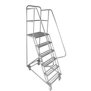 contamos con escaleras móviles tipo avión en alturas: 1 – 1,5 – 2 – 2,5 – 3 – 3,5 – 4 mtrs. con plataforma de trabajo con distintas capacidades de carga, peldaños antideslizante, ruedas giratorias con frenos.