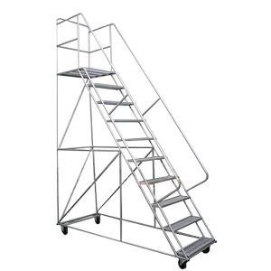 contamos con escaleras móviles tipo avión en alturas: 1 – 1,5 – 2 – 2,5 – 3 – 3,5 – 4 mtrs. con plataforma de trabajo con distintas capacidades de carga, peldaños antideslizante, ruedas giratorias con frenos.