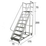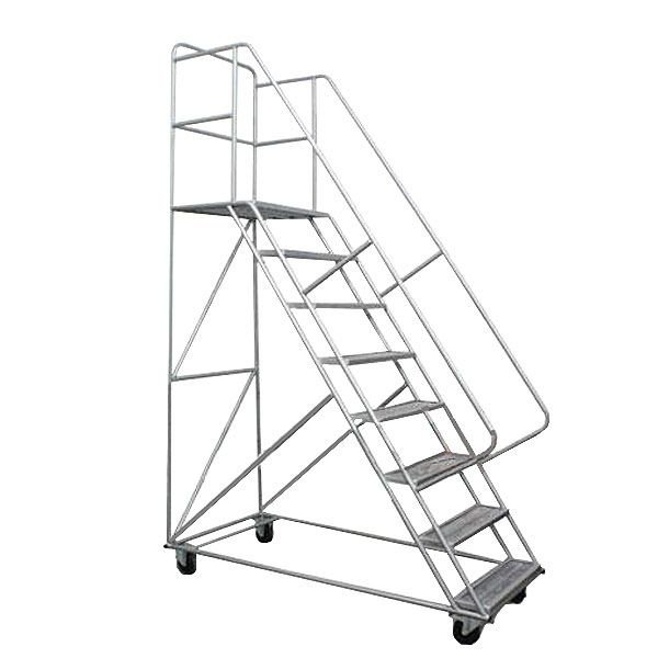 contamos con escaleras móviles tipo avión en alturas: 1 – 1,5 – 2 – 2,5 – 3 – 3,5 – 4 mtrs. con plataforma de trabajo con distintas capacidades de carga, peldaños antideslizante, ruedas giratorias con frenos.